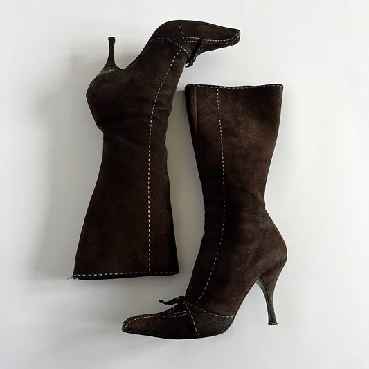 Prada Suede Boots With Bow Details Dark Brown (40 EU)