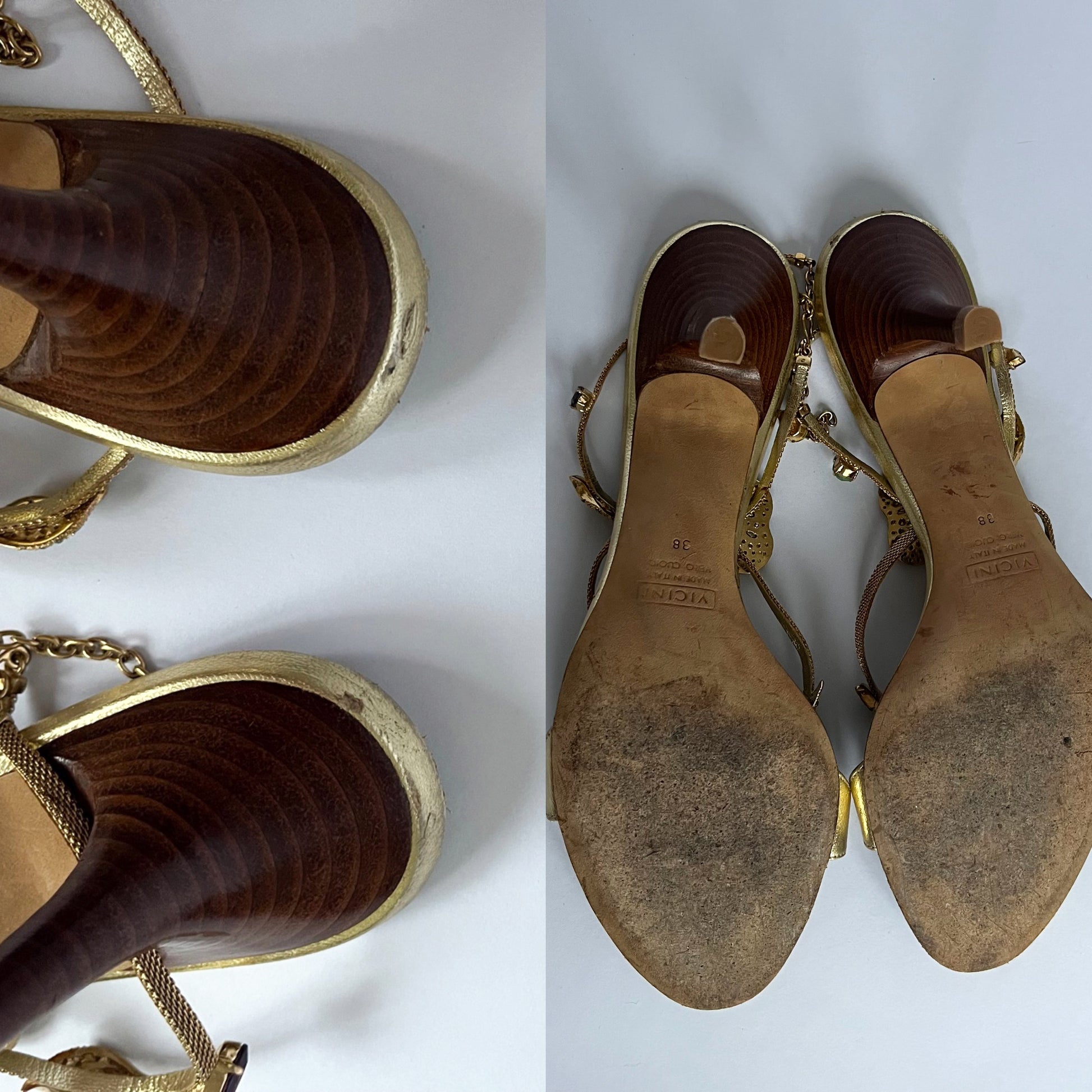 Condition: Fair vintage condition. Wear on soles & heels. Glue stains on insole. Missing gemstone (visible in pictures).